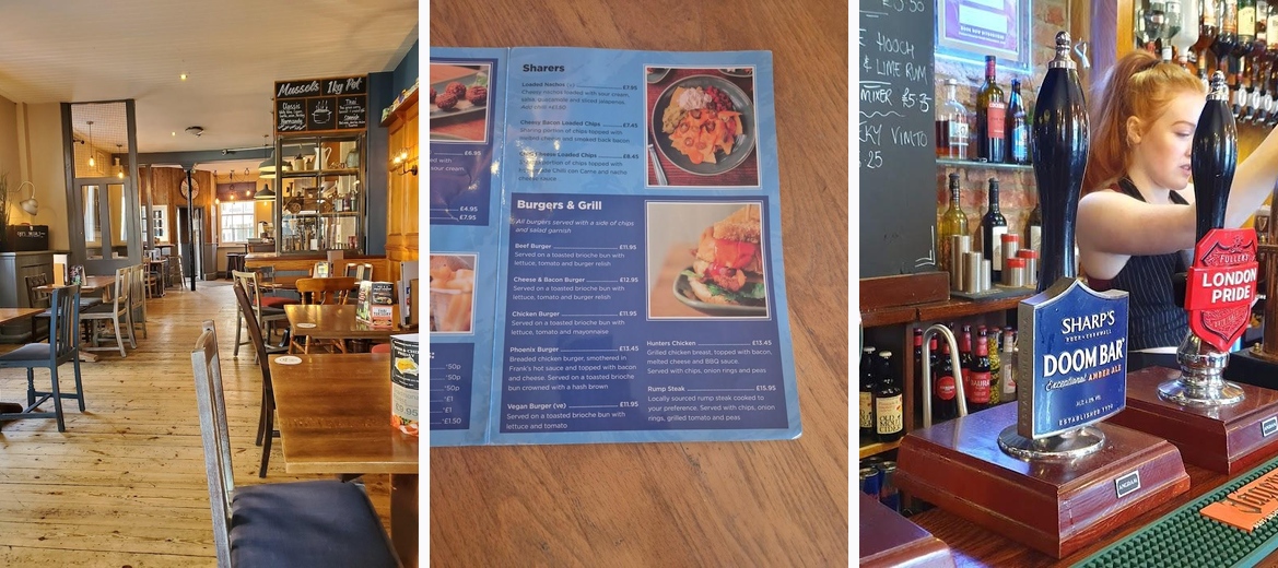 We needed a cold drink and a sit down during our visit to Romsey. The Phoenix stood centre stage on the high street. Not very alluring from the outside but just what we needed on the inside. A lovely chatty young lady served us a pint of ale and a lime and soda for a really good price compared to other establishments in the south of England. She chatted whilst she poured the drinks too which also makes a difference to me. Relatively quiet we found a table away from the bar and settled down. A typical old fashioned pub, nothing special, wooden floors, basic tables and chairs, 80s music playing in the background, quirky wall paper, nothing special but it had something, it had the ability to talk to your companion, it felt comfortable, not quite sure what it was but it definitely had something, maybe just the ambiance, who knows. If we were in Romsey again we would definitely pass through its doors again.